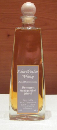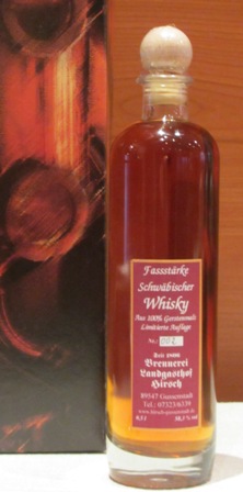 The incredients are 100% pure home-grown barley (single malt), and the precious liquid has been aging in a Swabian oak barrel for 6 years.